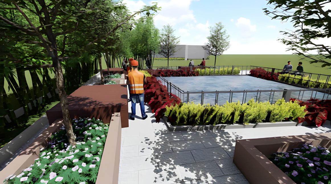 The project is in the industrial area. It provides an outdoor space to rest for staffs and an infiltration well garden to remove odors from industrial process.